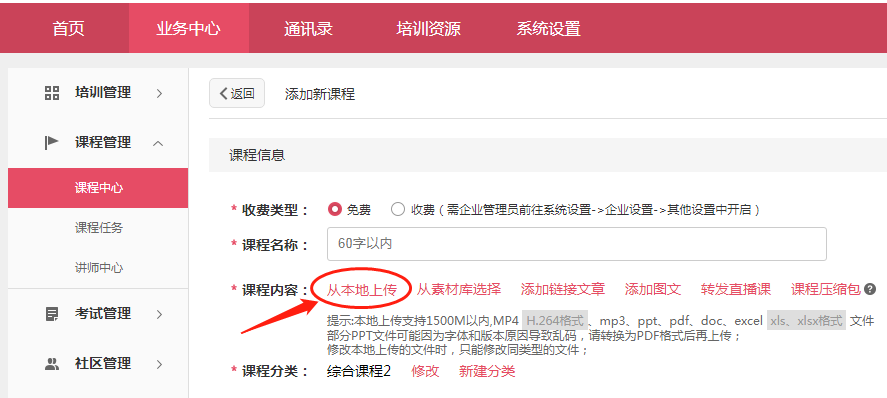 2、点击“从本地上传”,就可以添加视频、音频、文档课件了。